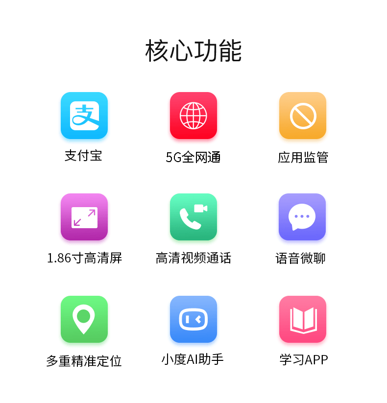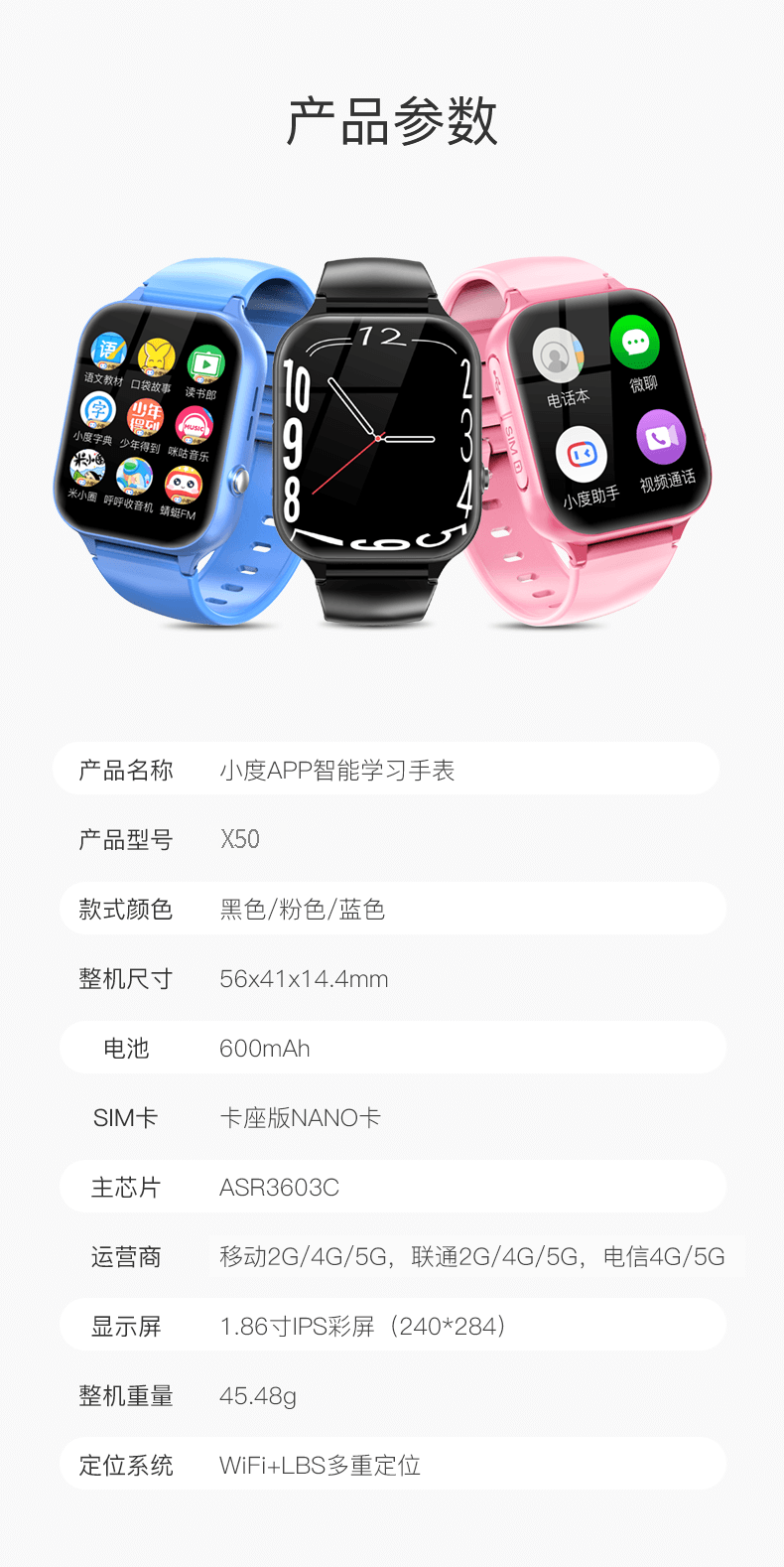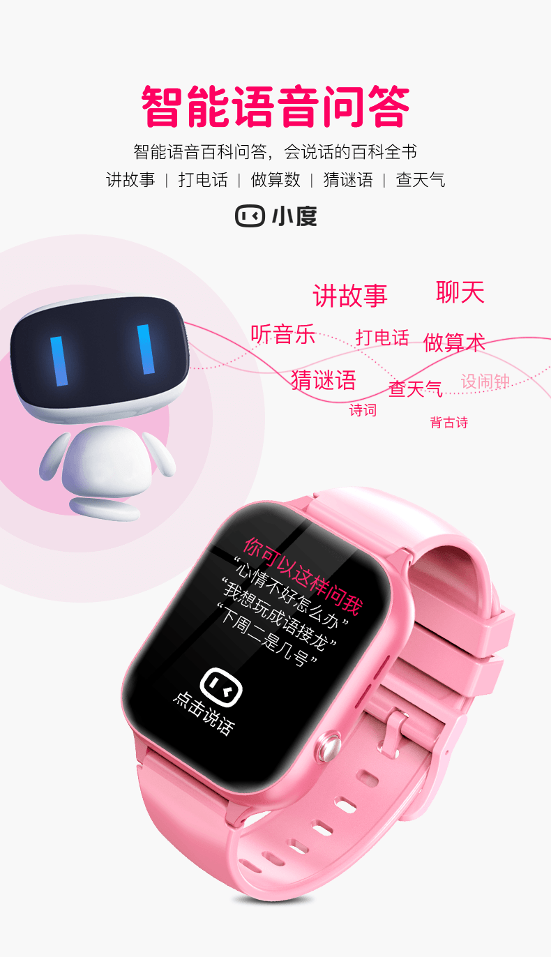 超長(cháng)待機7天、高(gāo)韌度ABS、AI機器人(rén)、視頻(pín)通(tōng)話(huà)、支付寶、學習(xí)APP、精準定位、IPS高(gāo)清顯示屏、深度防水(shuǐ)